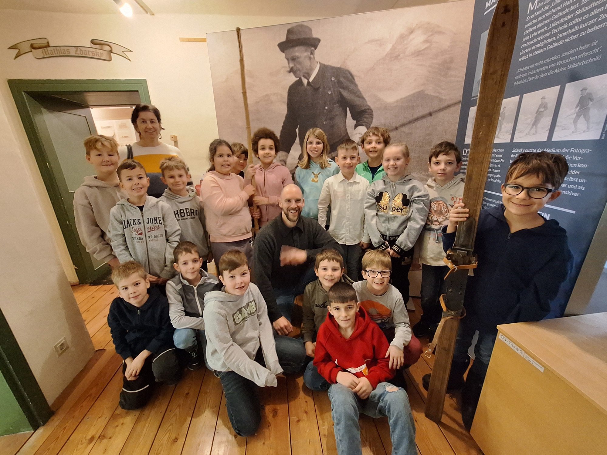 Am 2. Februar 2024 besuchte die 3. Klasse das Heimatmuseum. Herr Martin Krickl führte die Kinder durch die Ausstellung. Die Schülerinnen und Schüler lernten einiges über Mathias Zdarsky, den Erfinder des alpinen Schilaufs. Ebenfalls bewunderten die Kinder alte Gegenstände aus ihrer Heimat (alte Rechenmaschine aus Schrambach, Bergmannskappe, Kaffeekiste, …).