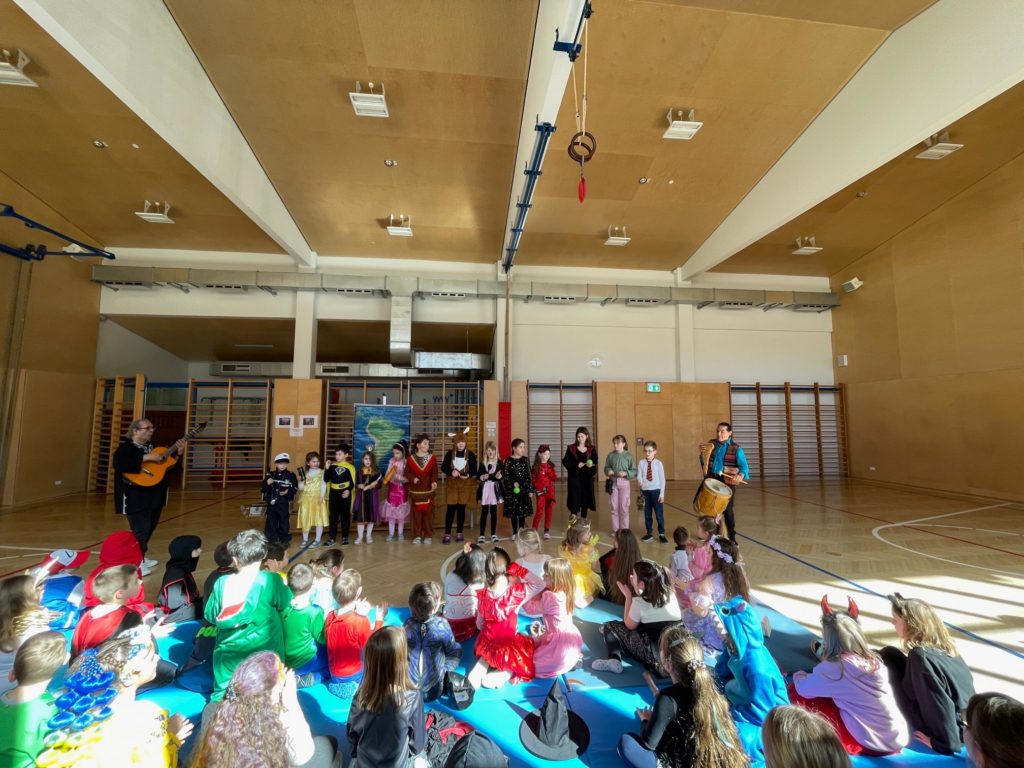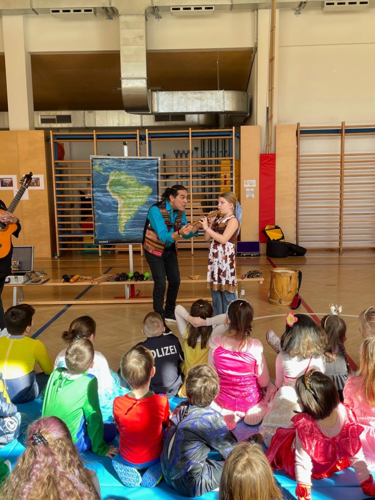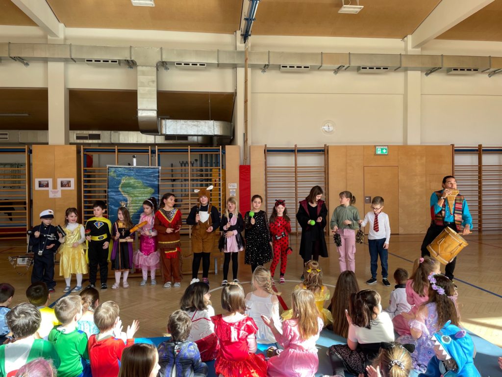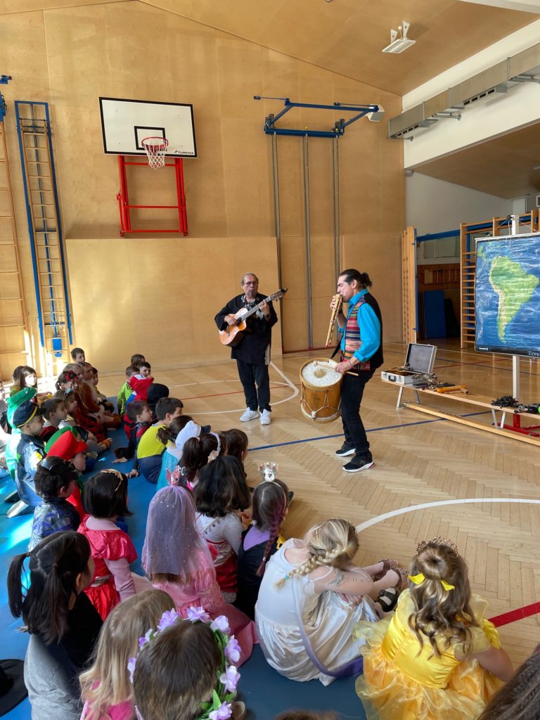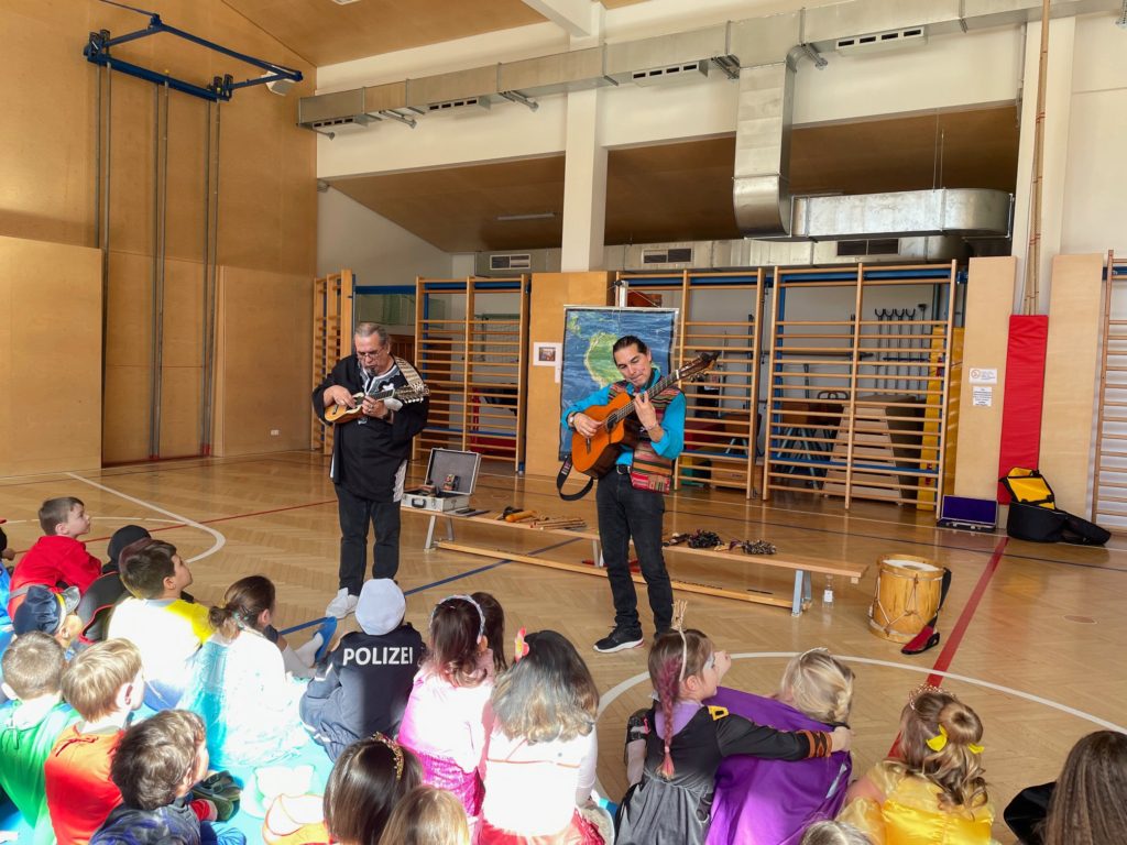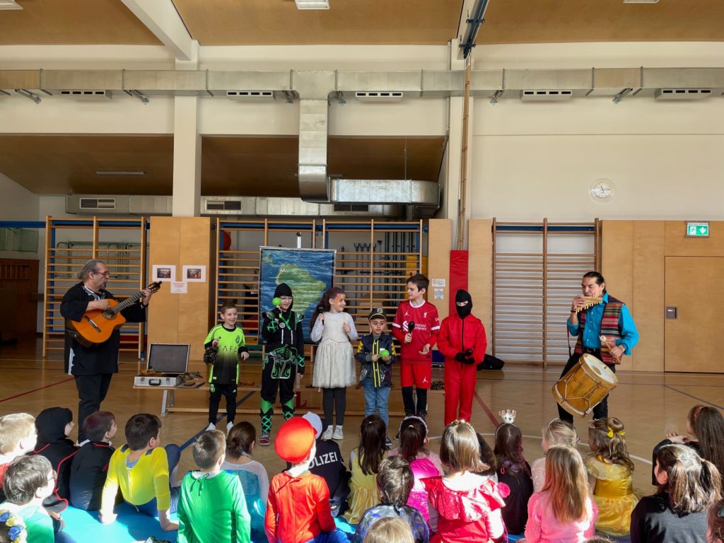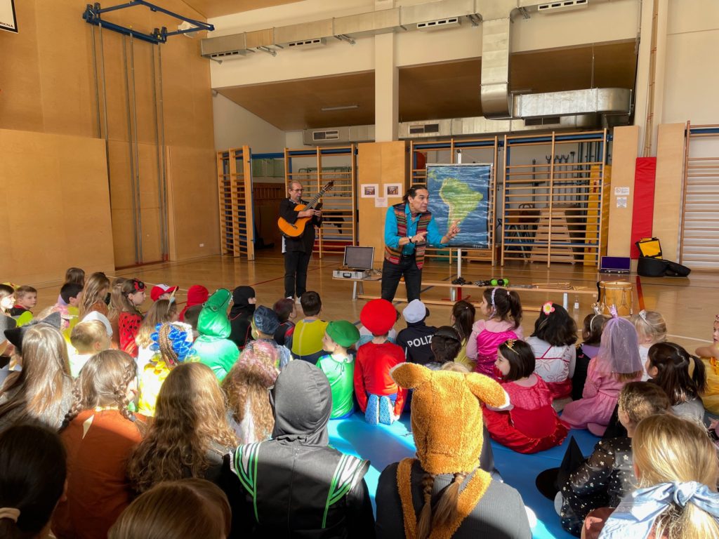 Am 04.03.2025 durften die Schülerinnen und Schüler verkleidet in die Schule kommen. In der 4. Stunde versammelten sich die Kinder im Turnsaal und genossen die Vorführung vom Fiesta Musical. Durch die chilenischen Musiker Rodrigo Sarmiento und Luis Parra lernten die Kinder unterschiedliche Rhythmen und damit die vielfältige Musik Lateinamerikas kennen.
