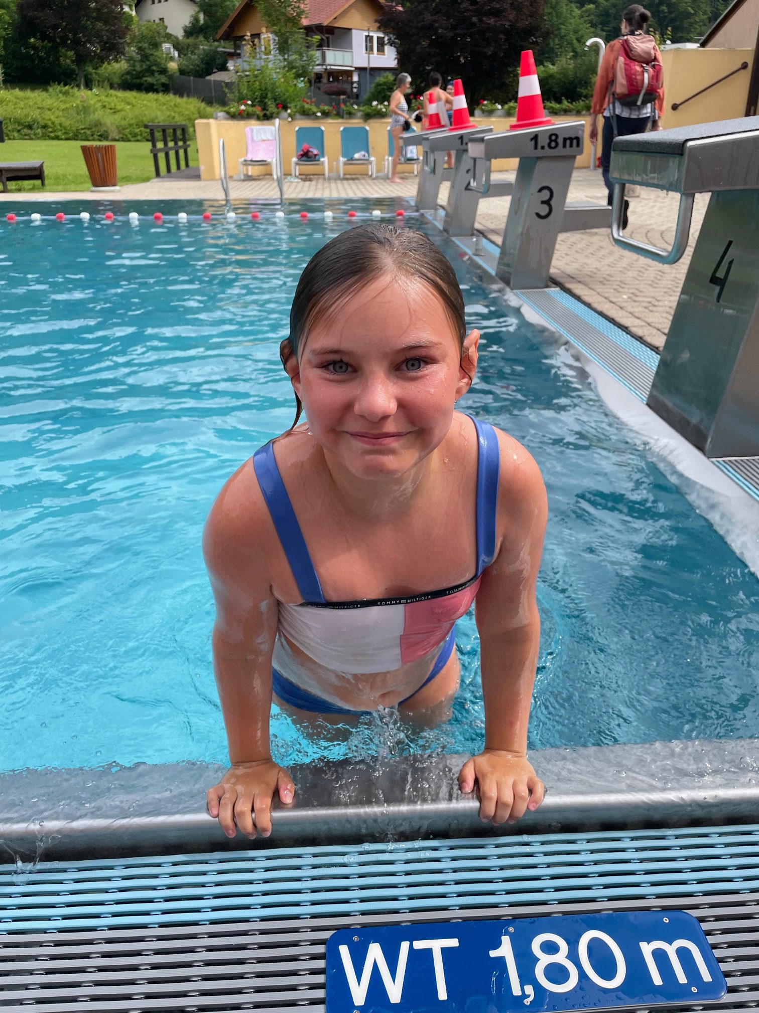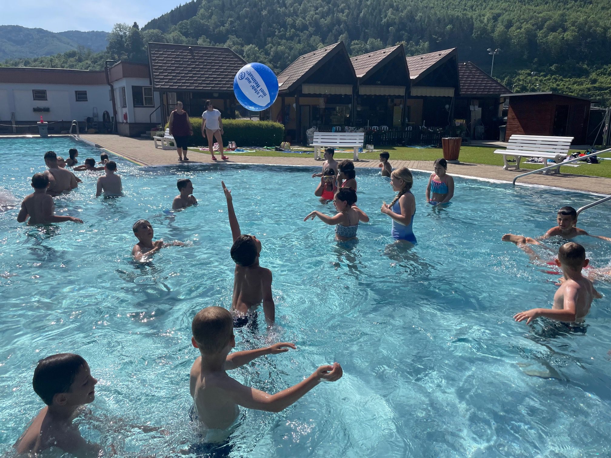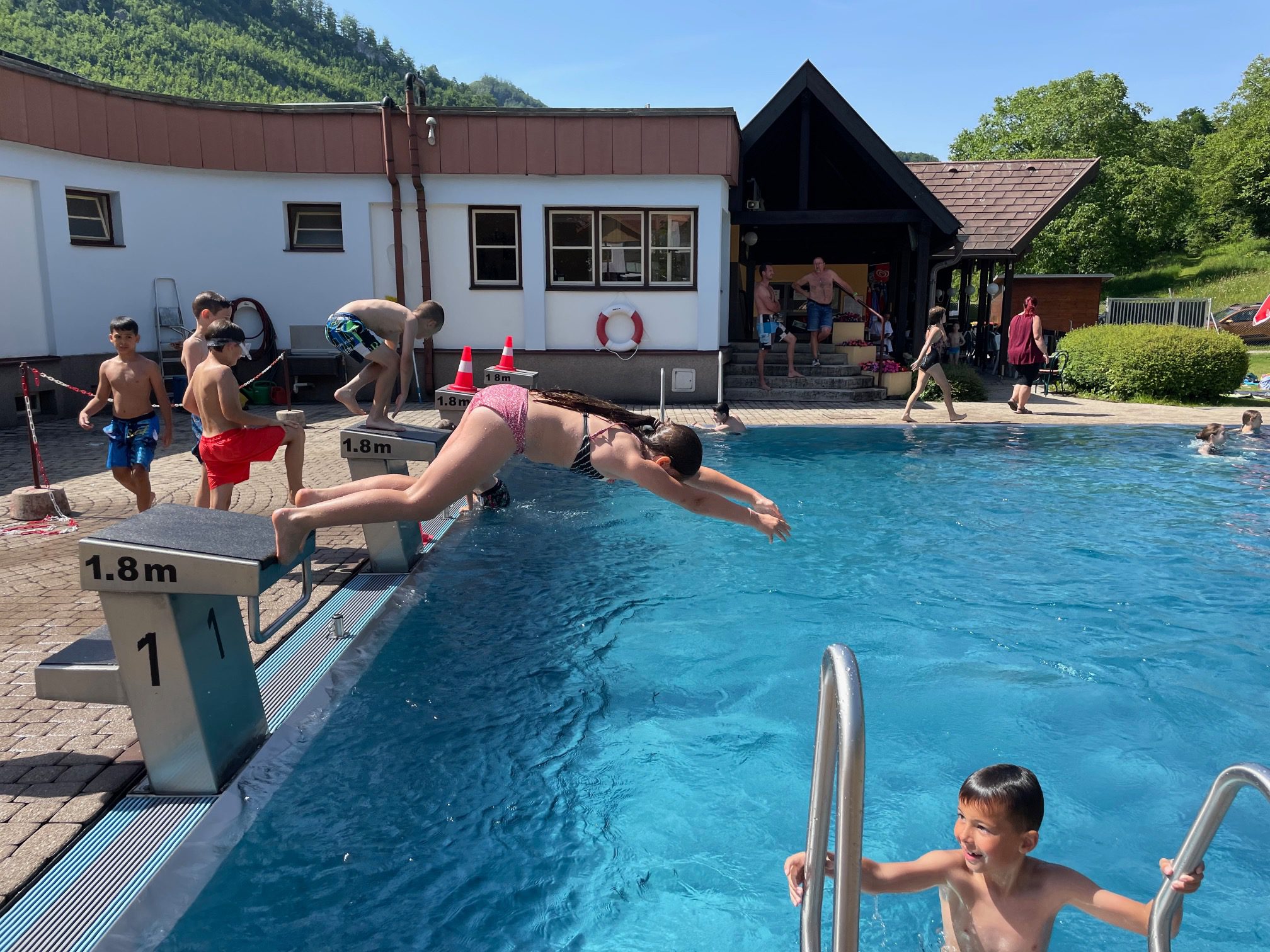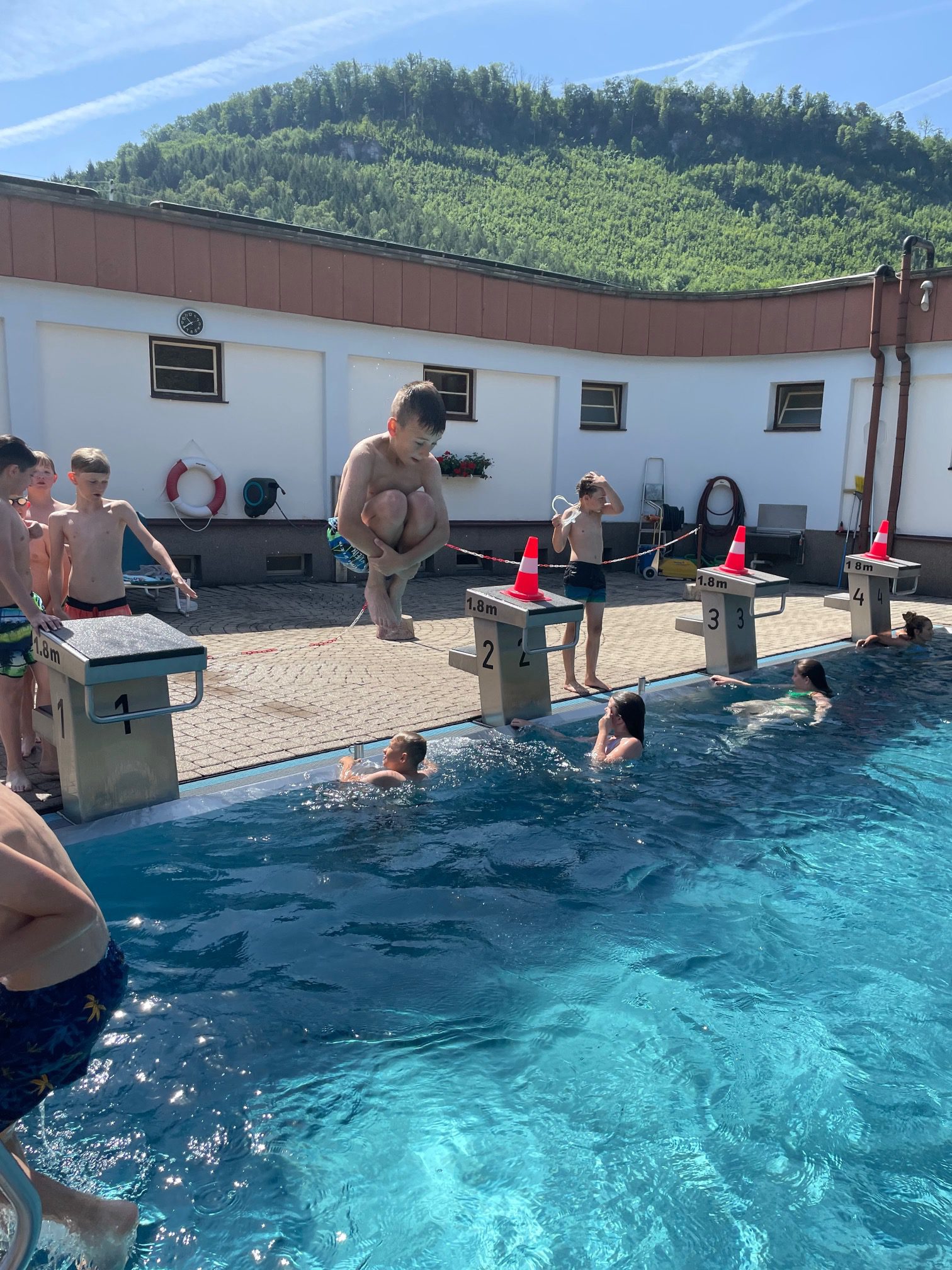 Im Juni nützen wir das schöne Wetter und die Nähe zum Freibad, um die Turnstunden im Schwimmbad zu verbringen. Dabei haben die Kinder sichtlich viel Spaß!